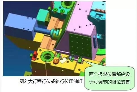 在模具結構中油缸應有行程限位控制開關,確?;钊讼叮煌瑫r應具備模具生產時自動控制所必須的信號源。