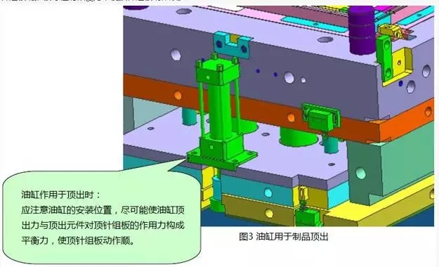 在此類應用中,應注意油缸的安裝位置,盡可能使油缸頂出力與頂出元件對頂針組板的作用力構成平衡力系,減少頂針組板動推板導柱的傾覆力,使頂針組板動作順。